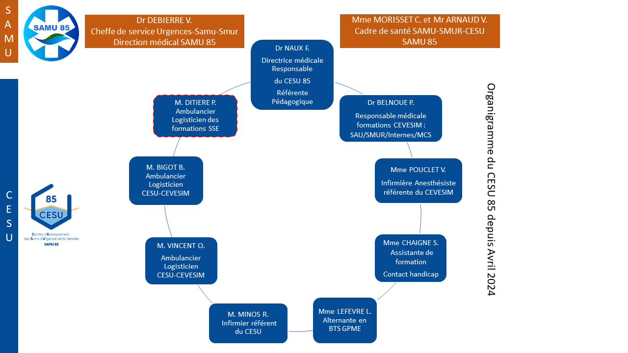 L'organigramme de l'équipe pédagogique du CESU 85 / CEVeSim est consultable ici : Organigramme équipe pédagogique du CESU 85
